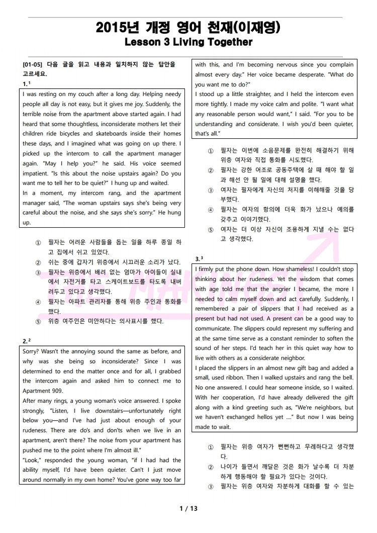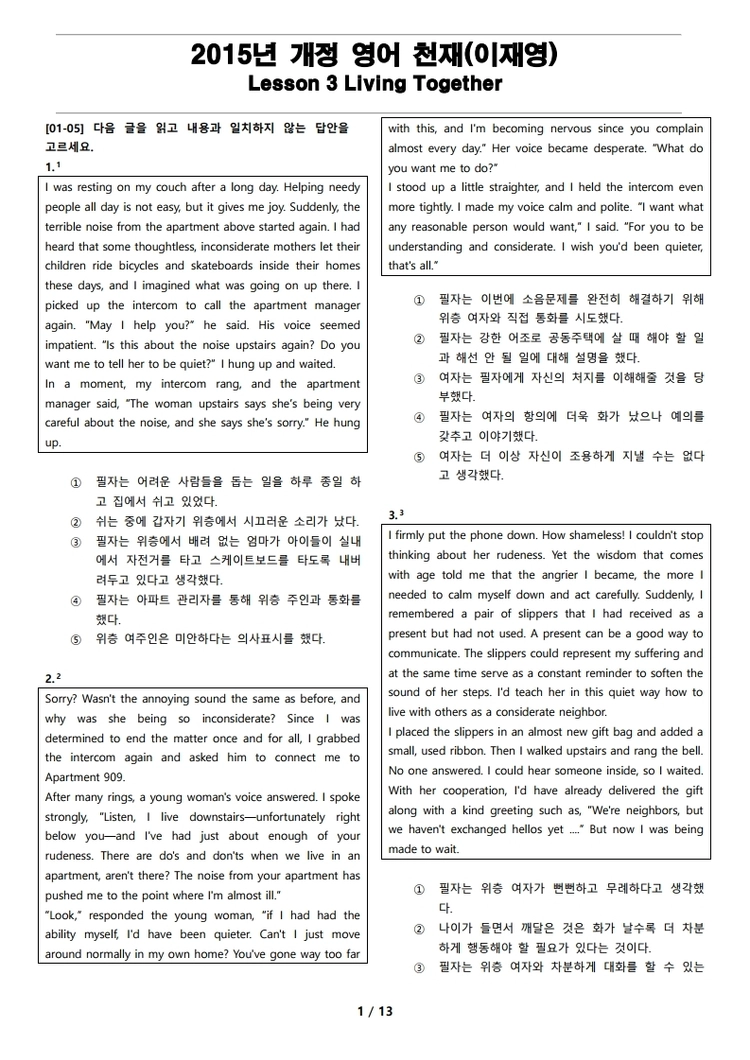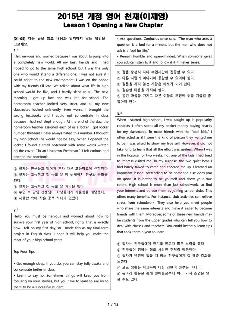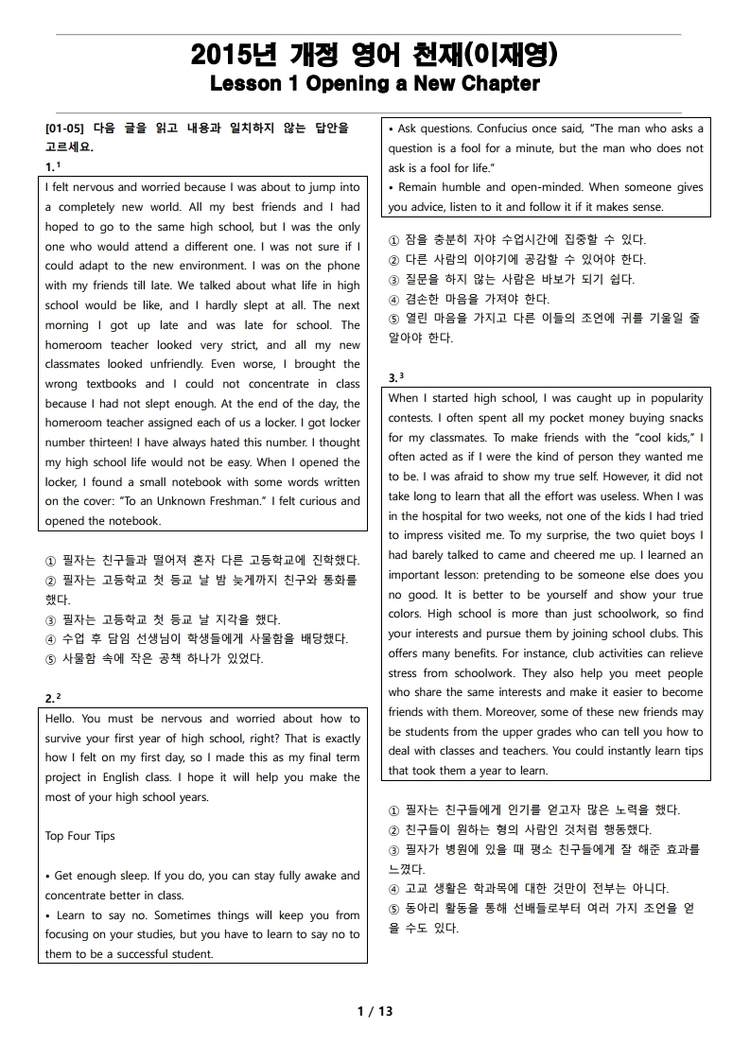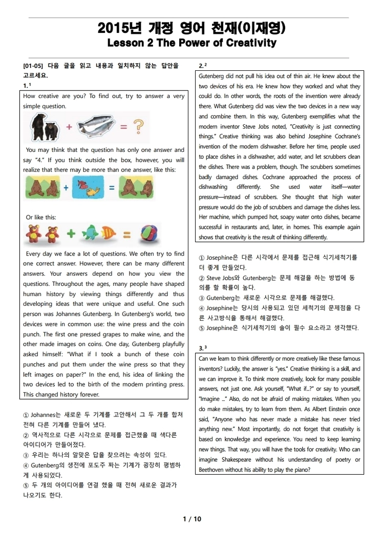영어 천재(이재영) (2015년 개정) 1강 변형 문제