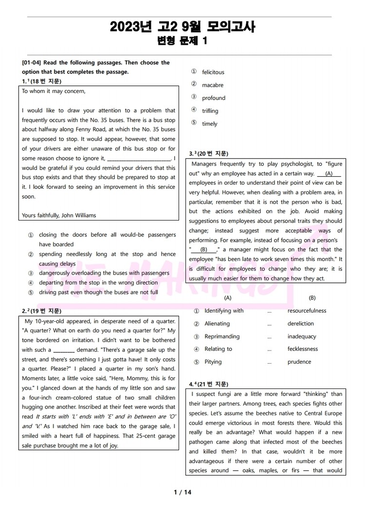 전체 지문 중에 실제 내신 시험에 출제 할 수 있는 지문을 위주로 출제 되어있습니다.