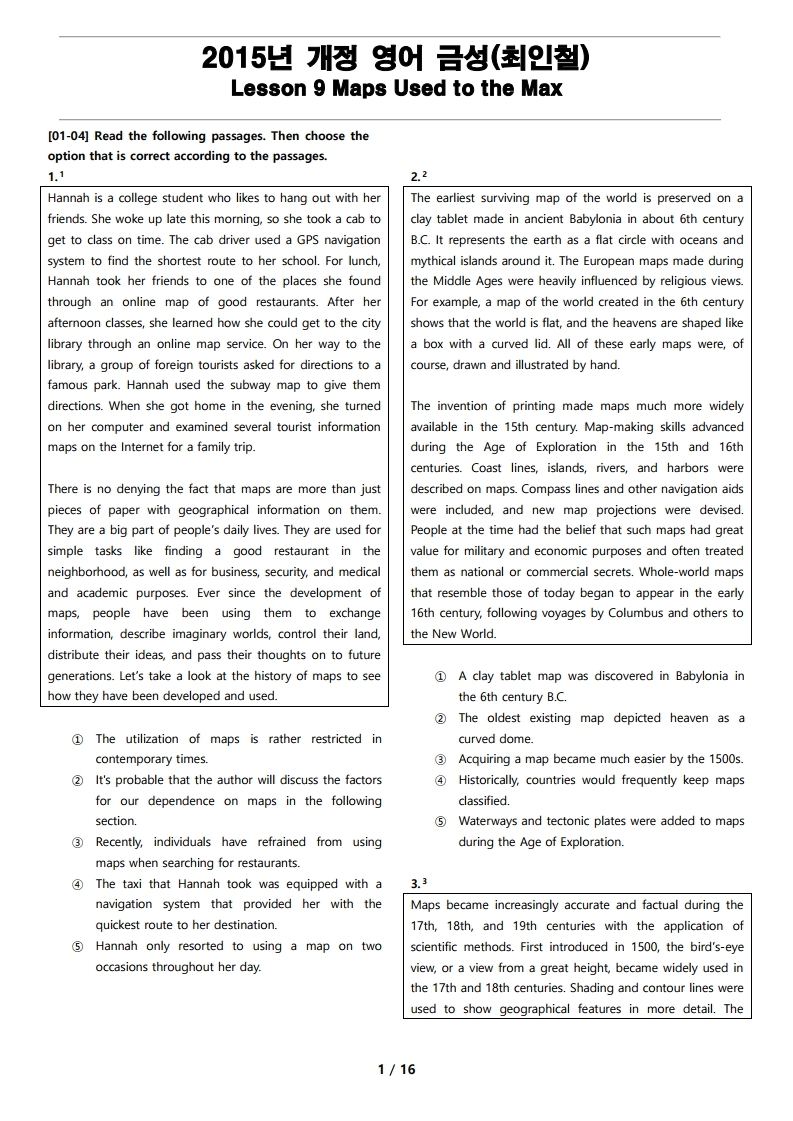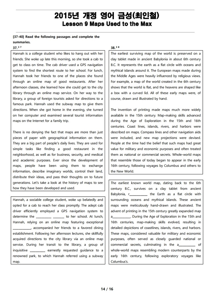 2015년 개정 영어 금성(최인철) 9과 변형 문제 Maps Used to the Max
