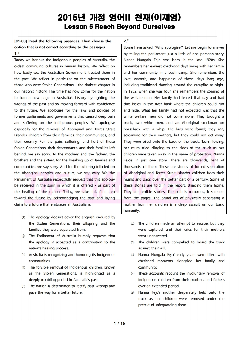 2015년 개정 영어 II 천재(이재영) 6과 변형 문제 Reach Beyond Ourselves