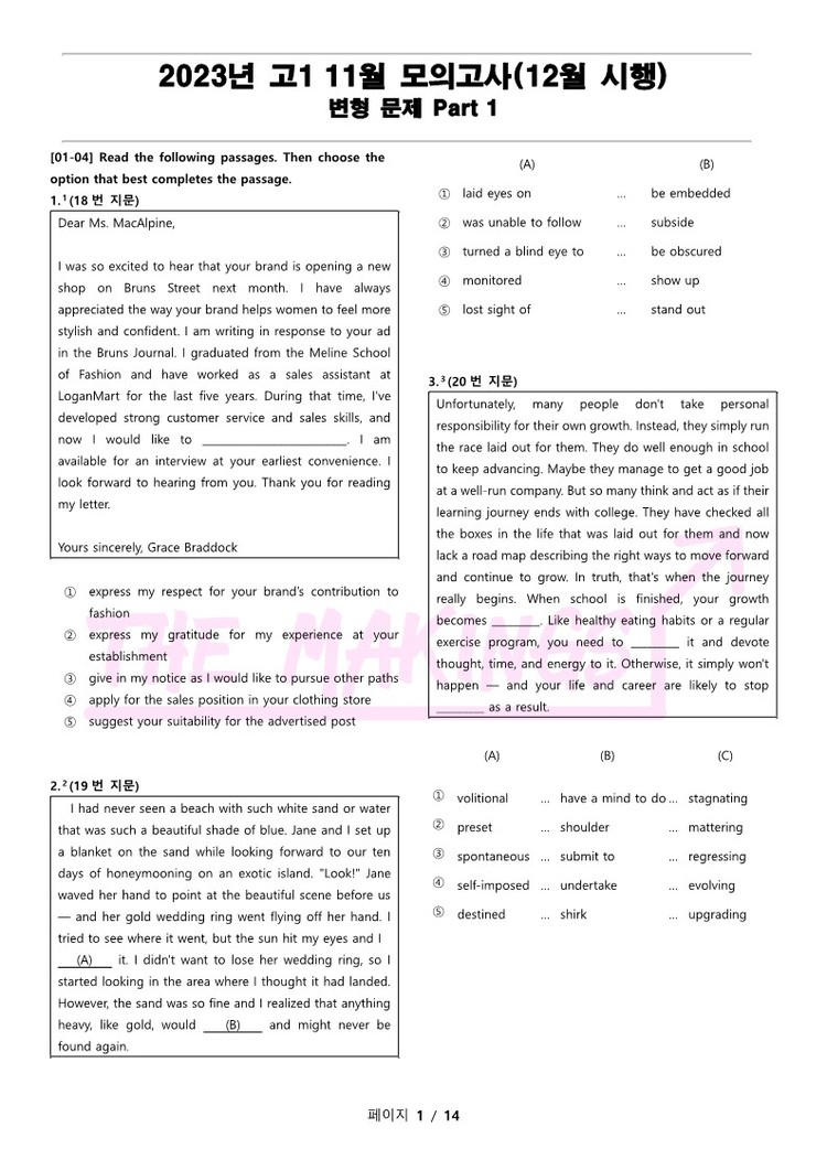 2023년 고1 11월(12월 시행) 전국 연합 모의고사 변형 문제 Part 1 (44문항) (PDF)