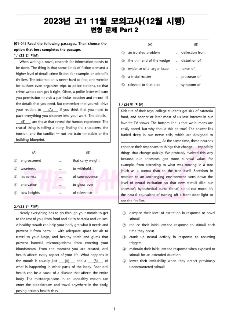일반 워크북 형태의 문제에서 벗어나 The Makings가 만든 2023년 고1 11월(12월 시행) 전국 연합 모의고사 변형 문제 Part 2