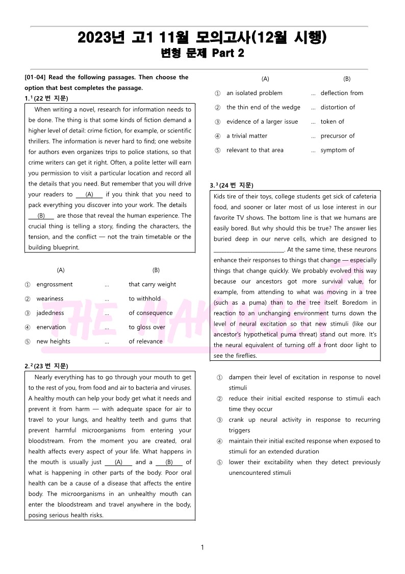 현직에서 강사를 하고 있는 연구진들이 학생들을 위한 최상의 2023년 고1 11월(12월 시행) 전국 연합 모의고사 변형 문제 Part 2 를 선보입니다.