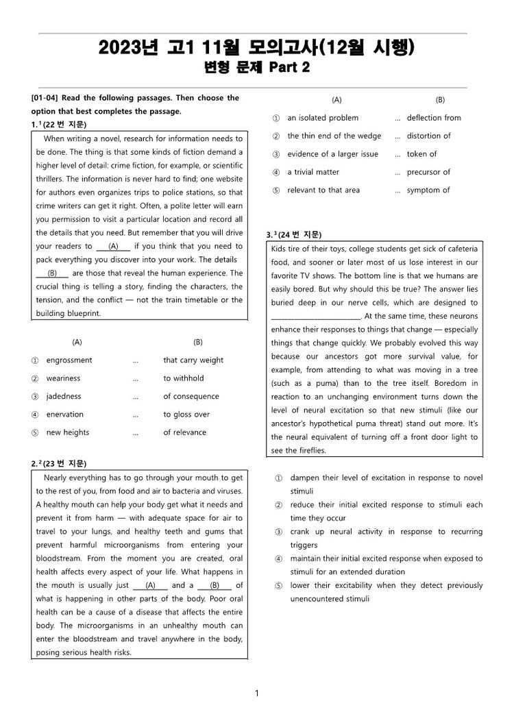 2023년 고1 11월(12월 시행) 전국 연합 모의고사 변형 문제 Part 2 (44문항) (워드파일)