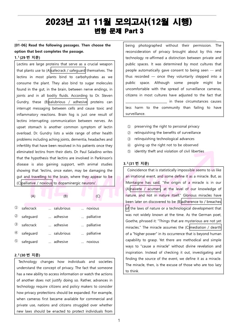 2023년 고2 11월(12월 시행) 전국 연합 모의고사 변형 문제 Part 3 (66문항) (PDF)