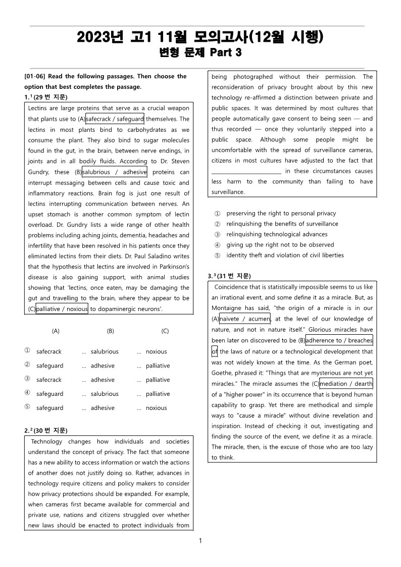 현직에서 강사를 하고 있는 연구진들이 학생들을 위한 최상의 2023년 고2 11월(12월 시행) 전국 연합 모의고사 변형 문제 Part 3 을 선보입니다.