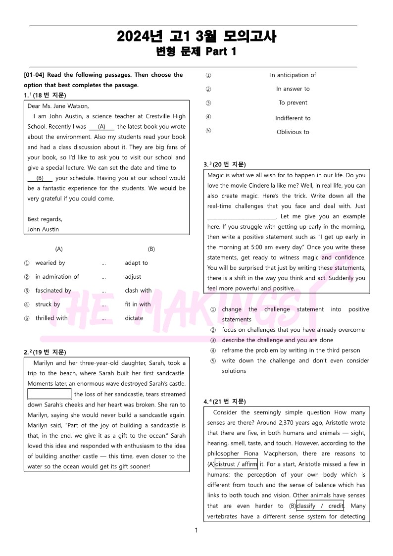 일반 워크북 형태의 문제에서 벗어나 The Makings가 만든 2024년 고1 3월 전국 연합 모의고사 변형 문제 Part 1