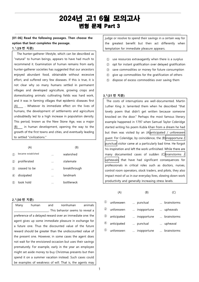 2024년 고1 6월 전국 연합 모의고사 변형 문제 Part 3