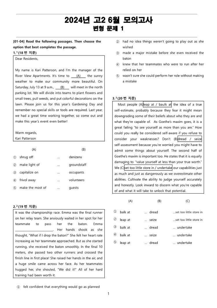 2024년 고 2 6월 전국 연합 모의고사 변형 문제 Part 1