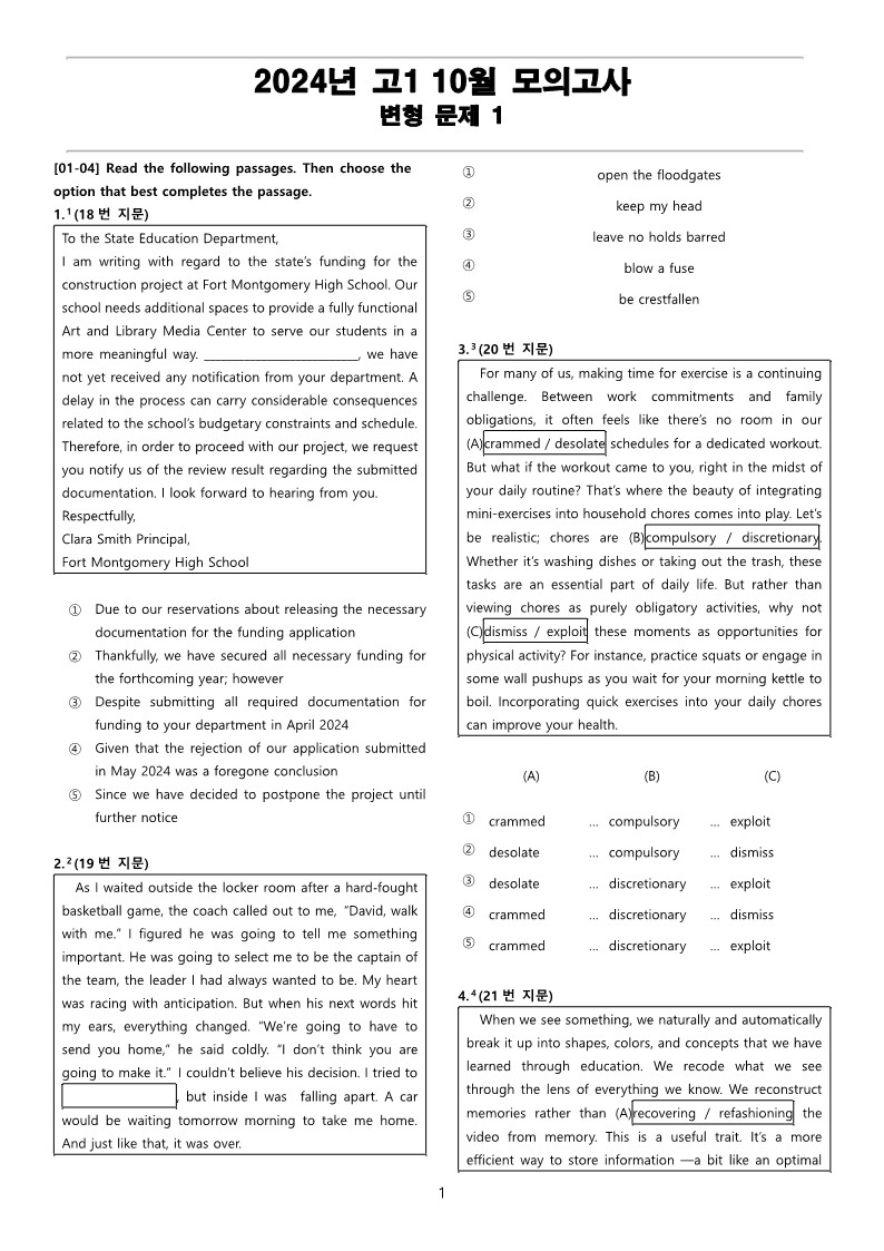 2024년 고1 10월 전국 연합 모의고사 변형 문제 Part 1