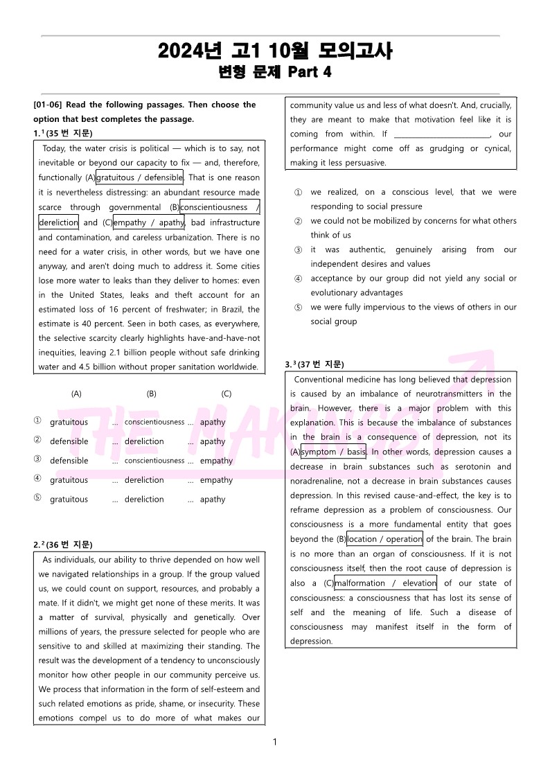 현직에서 강사를 하고 있는 연구진들이 학생들을 위한 최상의 2024년 고1 10월 전국 연합 모의고사 변형 문제 Part 4를 선보입니다.