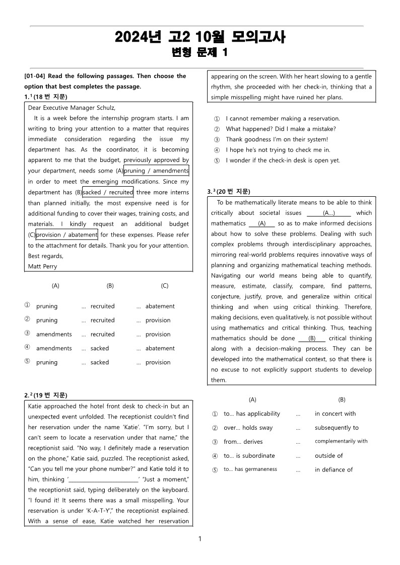 2024년 고2 10월 전국 연합 모의고사 변형 문제 Part 1