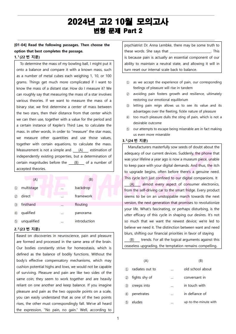 현직에서 강사를 하고 있는 연구진들이 학생들을 위한 최상의 2024년 고2 10월 전국 연합 모의고사 변형 문제 Part 2를 선보입니다.