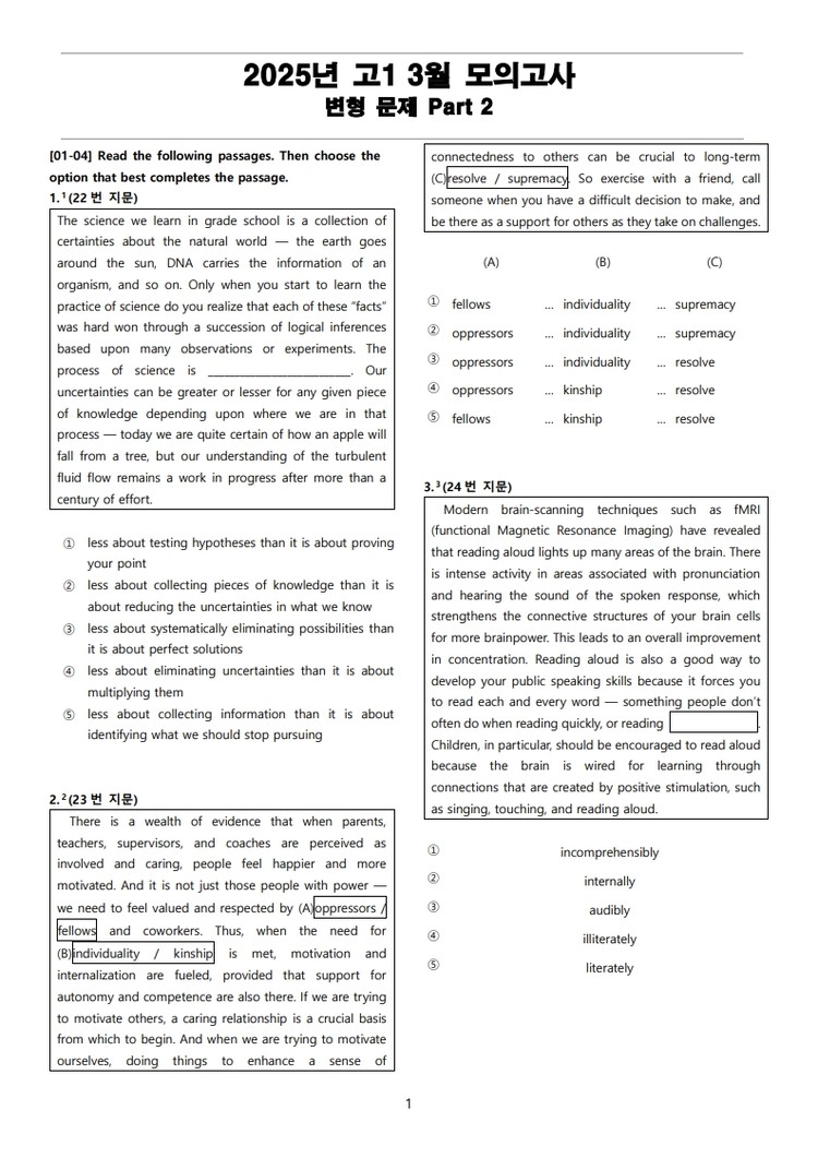 2025년 고1 3월 전국 연합 모의고사 변형 문제 Part 2