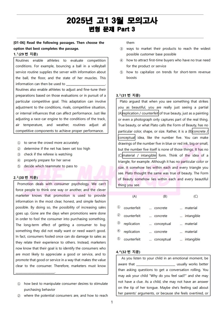 일반 워크북 형태의 문제에서 벗어나 The Makings가 만든 2025년 고1 3월 전국 연합 모의고사 변형 문제 Part 3
