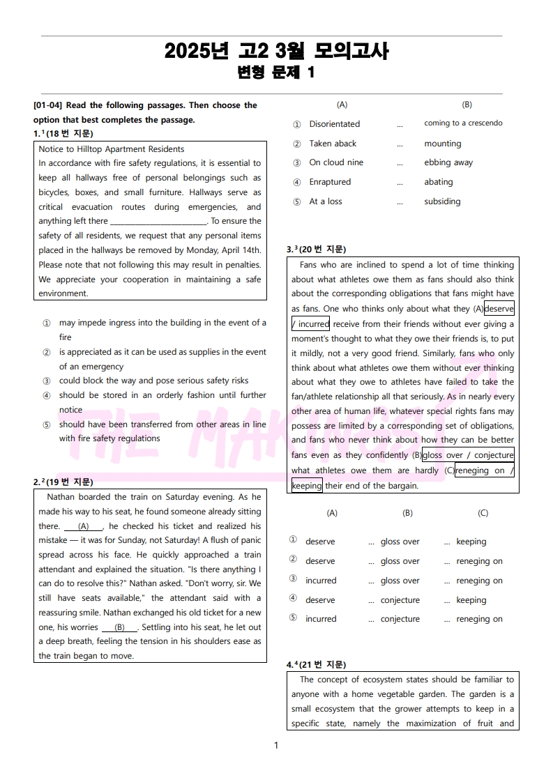 일반 워크북 형태의 문제에서 벗어나 The Makings가 만든 2025년 고2 3월 전국 연합 모의고사 변형 문제 Part 1