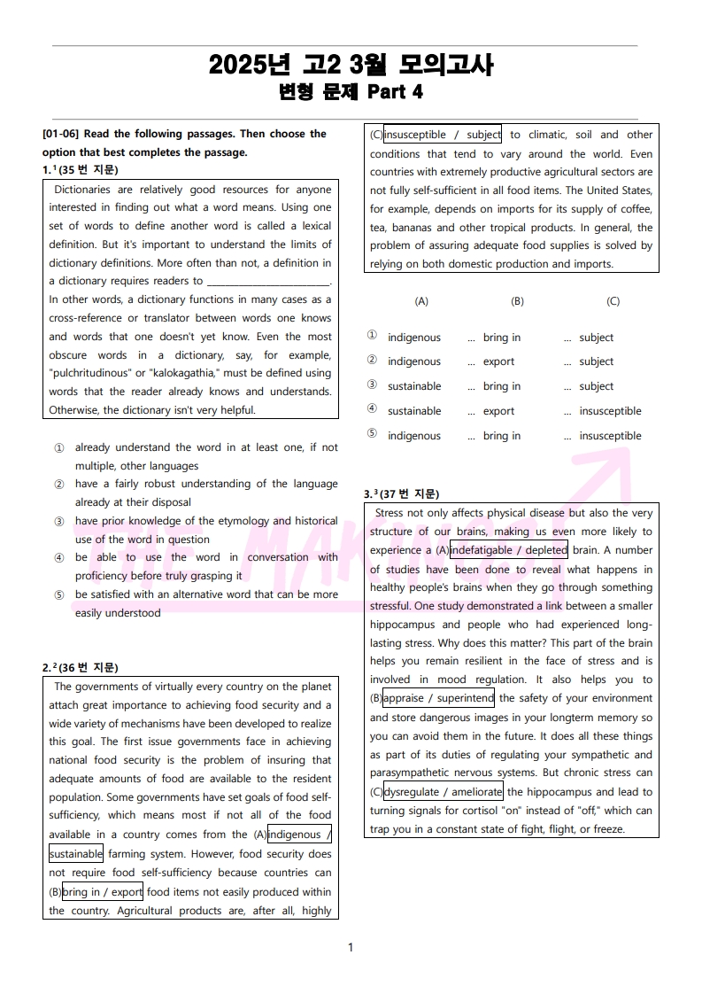 현직에서 강사를 하고 있는 연구진들이 학생들을 위한 최상의 2025년 고2 3월 전국 연합 모의고사 변형 문제 Part 4 를 선보입니다.