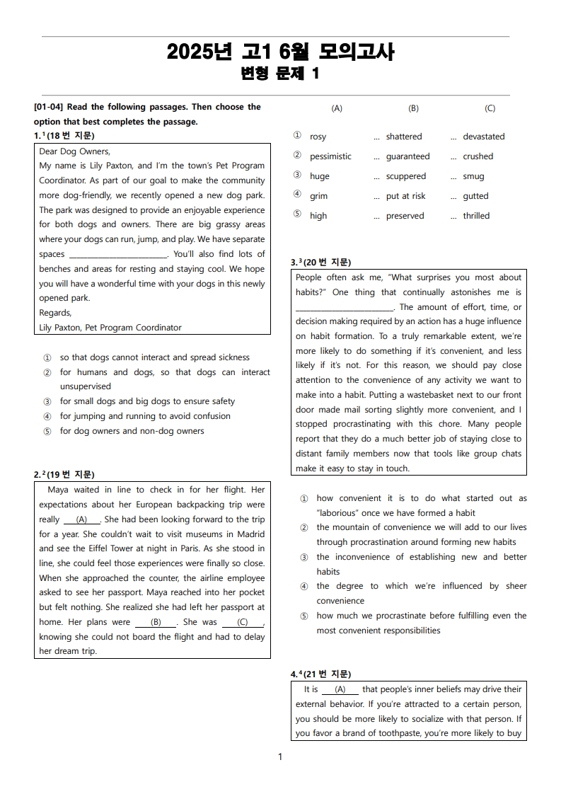 2025년 고1 6월 전국 연합 모의고사 변형 문제 Part 1