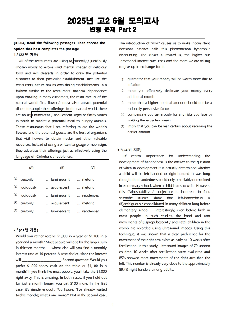 2025년 고2 6월 전국 연합 모의고사 변형 문제 Part 2 (44문항) (워드파일/편집가능)