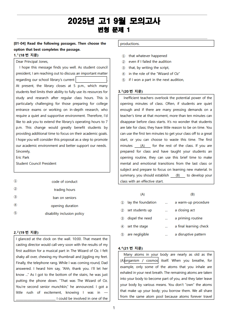 2025년 고1 9월 전국 연합 모의고사 변형 문제 Part 1