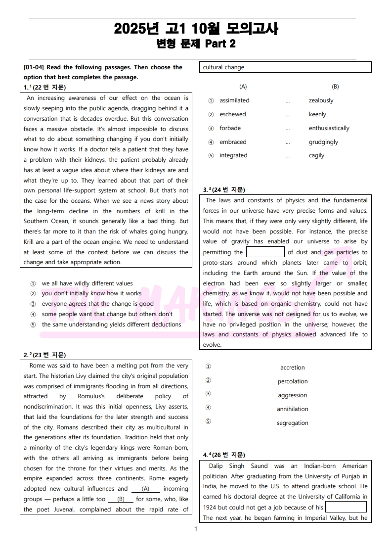 더메이킹스(The Makings)가 제작한 2025년 고1 10월 전국 연합 모의고사 변형 문제 Part 2의 지문입니다.