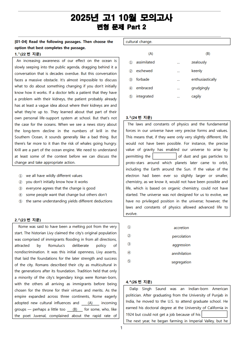 2025년 고1 10월 전국 연합 모의고사 변형 문제 Part 2
