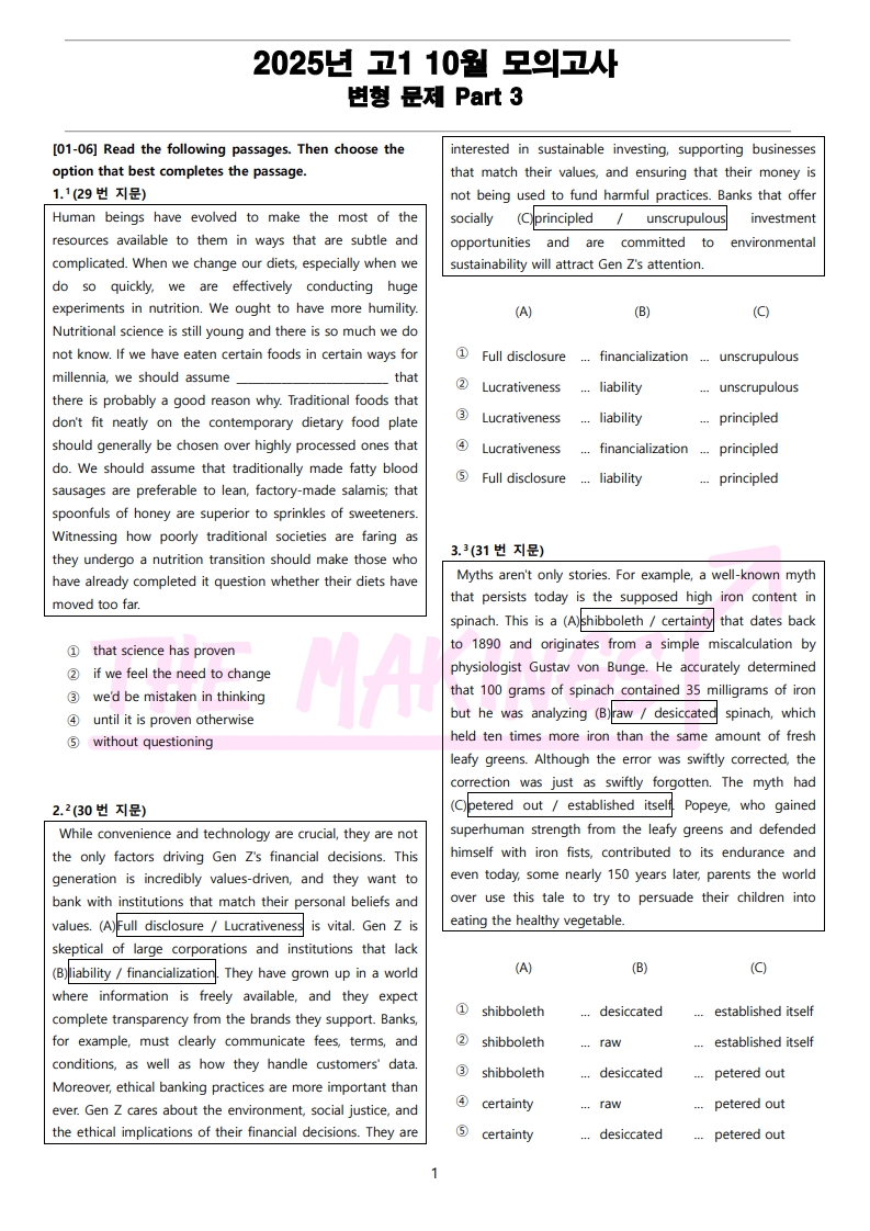 일반 워크북 형태의 문제에서 벗어나 The Makings가 만든 2025년 고1 10월 전국 연합 모의고사 변형 문제 Part 3