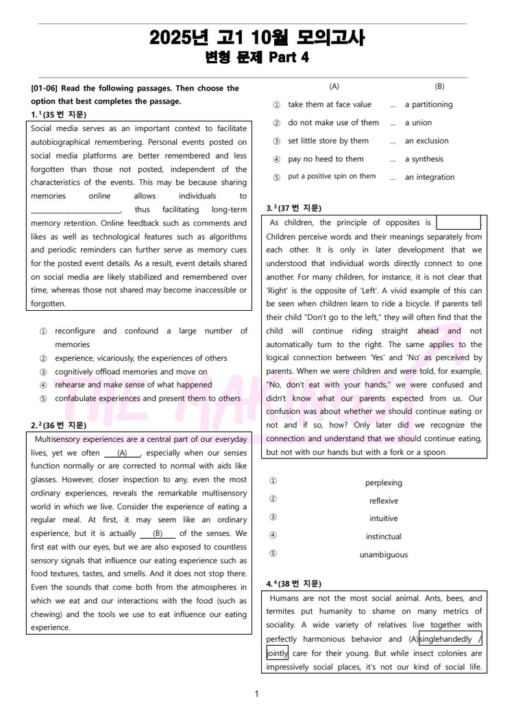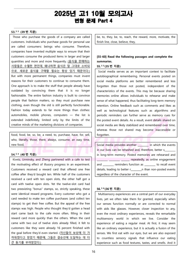 일반 워크북 형태의 문제에서 벗어나 The Makings가 만든 2025년 고1 10월 전국 연합 모의고사 변형 문제 Part 4
