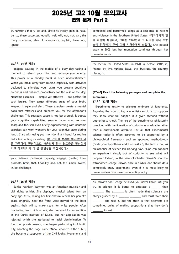 일반 워크북 형태의 문제에서 벗어나 The Makings가 만든 2025년 고2 10월 전국 연합 모의고사 변형 문제 Part 2