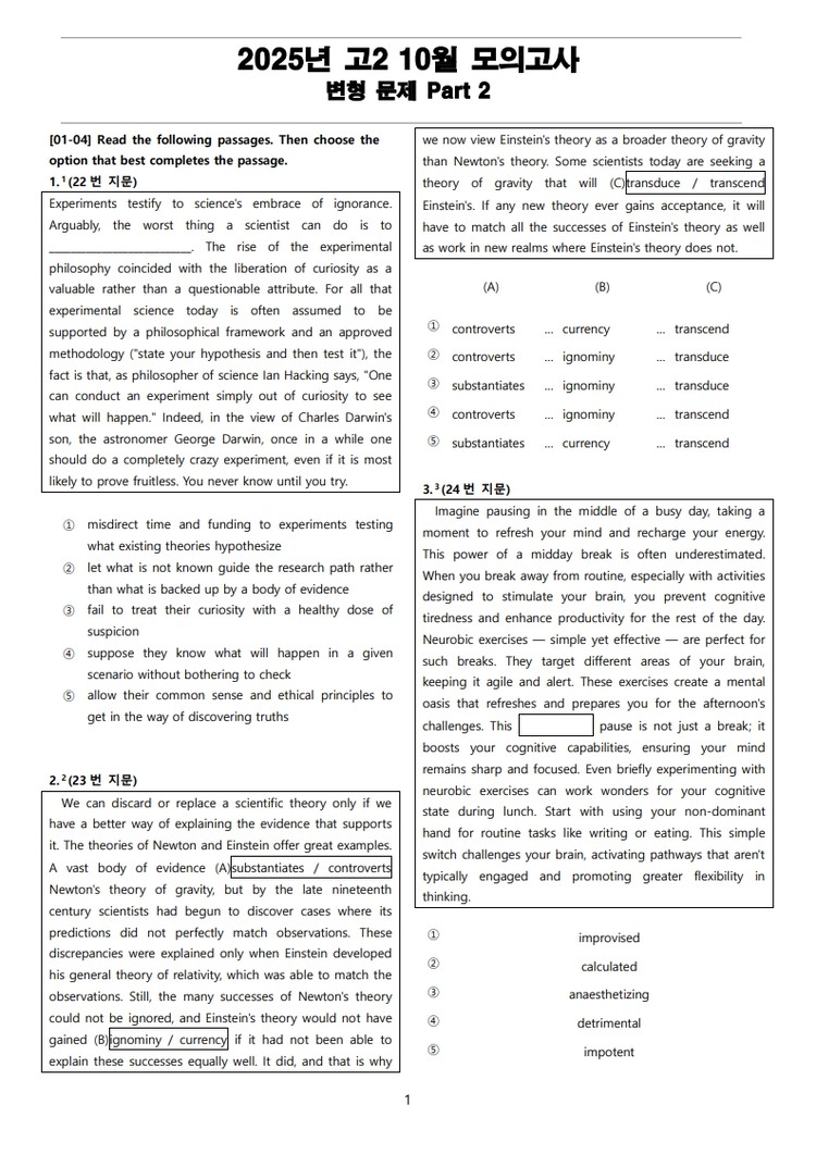 현직에서 강사를 하고 있는 연구진들이 학생들을 위한 최상의 2025년 고2 10월 전국 연합 모의고사 변형 문제 Part 2를 선보입니다.