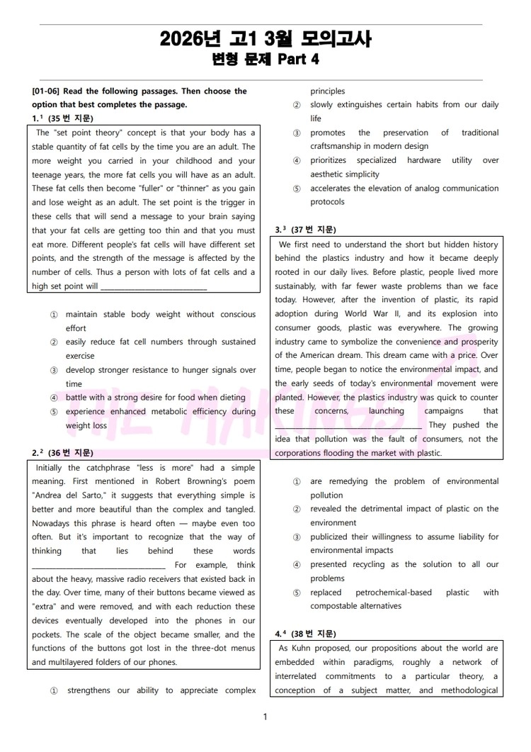 더메이킹스(The Makings)가 제작한 2026년 고1 3월 전국 연합 모의고사 변형 문제 Part 4의 지문입니다.