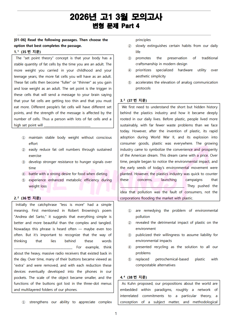 2026년 고1 3월 전국 연합 모의고사 변형 문제 Part 4 (66문항) (PDF)