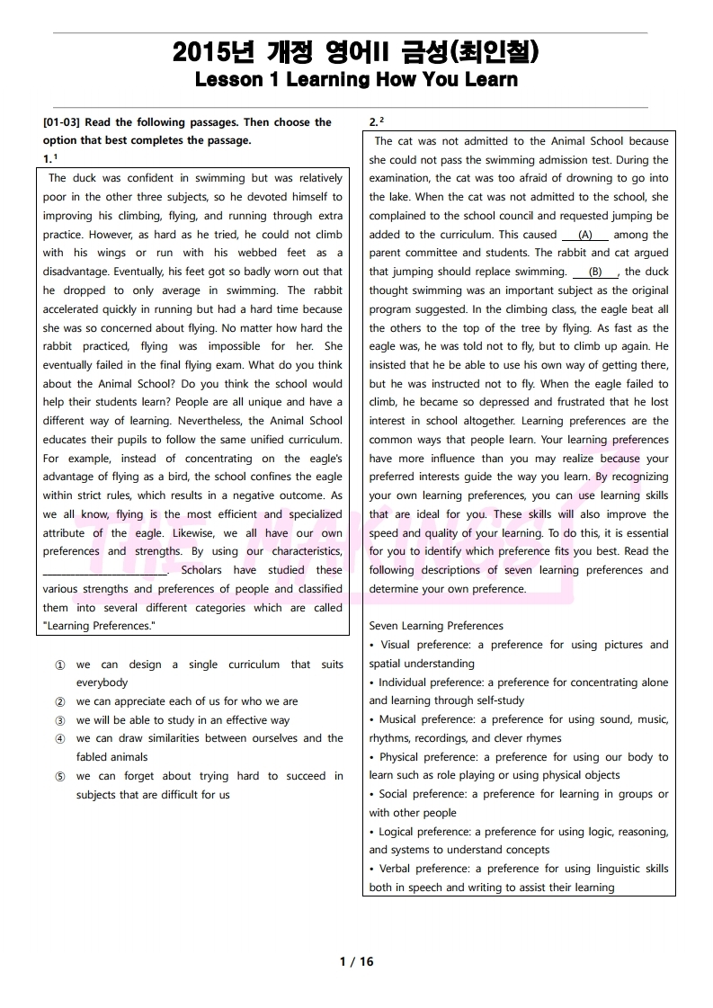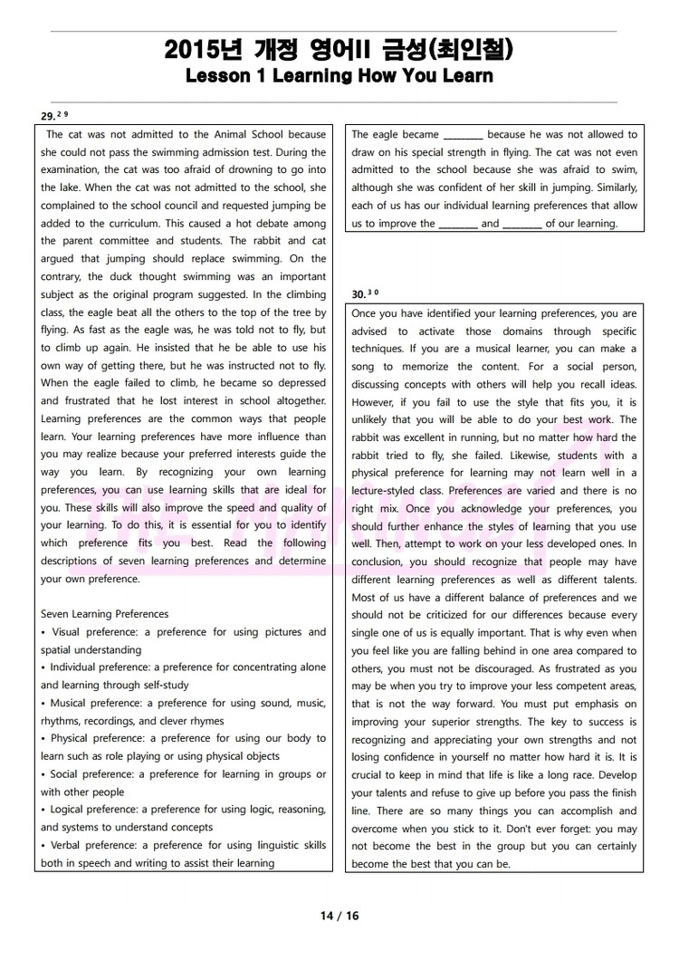 중간고사&기말고사 전에 더메이킹스(The Makings)에서 제작한 2015년 개정 영어 II 금성(최인철) 1과 변형 문제로 마무리 하세요.
