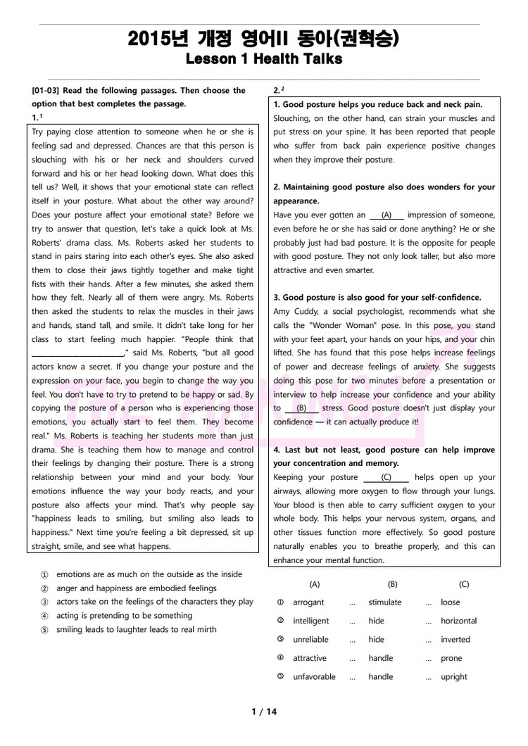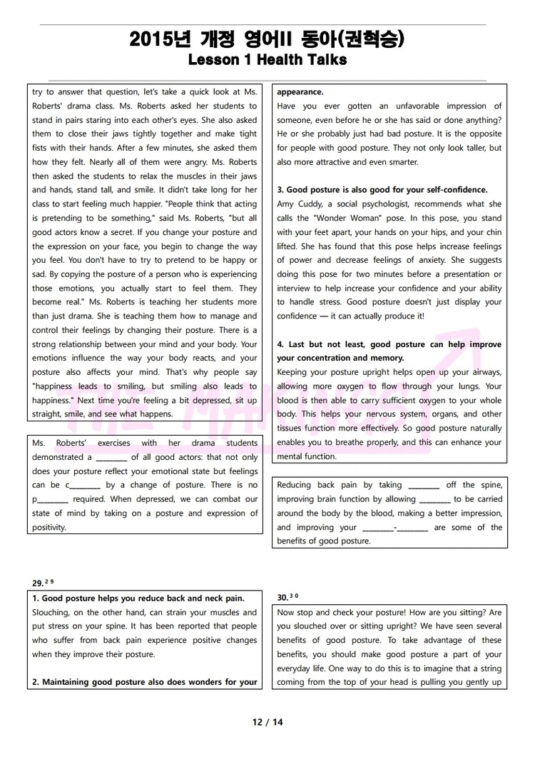현직에서 강사를 하고 있는 연구진들이 학생들을 위한 최상의 2015년 개정 영어 II 동아(권혁승) 1과 변형 문제를 선보입니다.