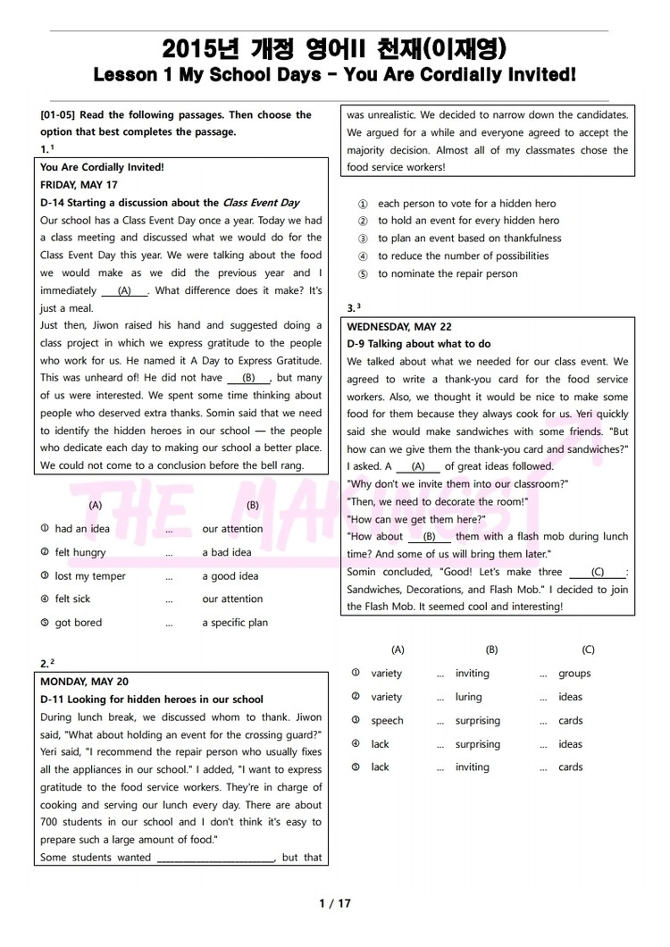 현직에서 강사를 하고 있는 연구진들이 학생들을 위한 최상의 2015년 개정 영어 II 천재(이재영) 1과 변형 문제를 선보입니다.
