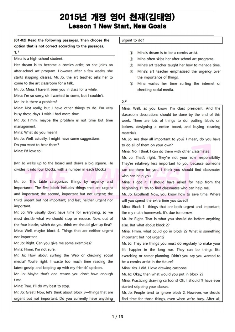 더메이킹스(The Makings)가 제작한 2015년 개정 영어 천재(김태영) 1과의 지문입니다.