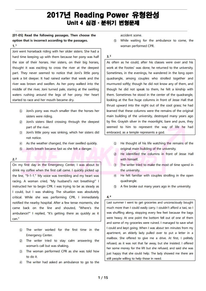 중간고사&기말고사 전에 더메이킹스(The Makings)에서 제작한 EBS 리딩 파워(Reading Power) 유형 완성 (2017년 개정) 변형 문제 4강으로 최종 모의고사로 마무리하세요.