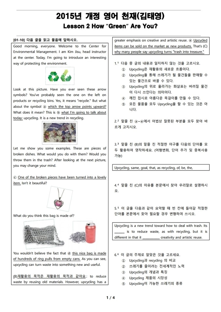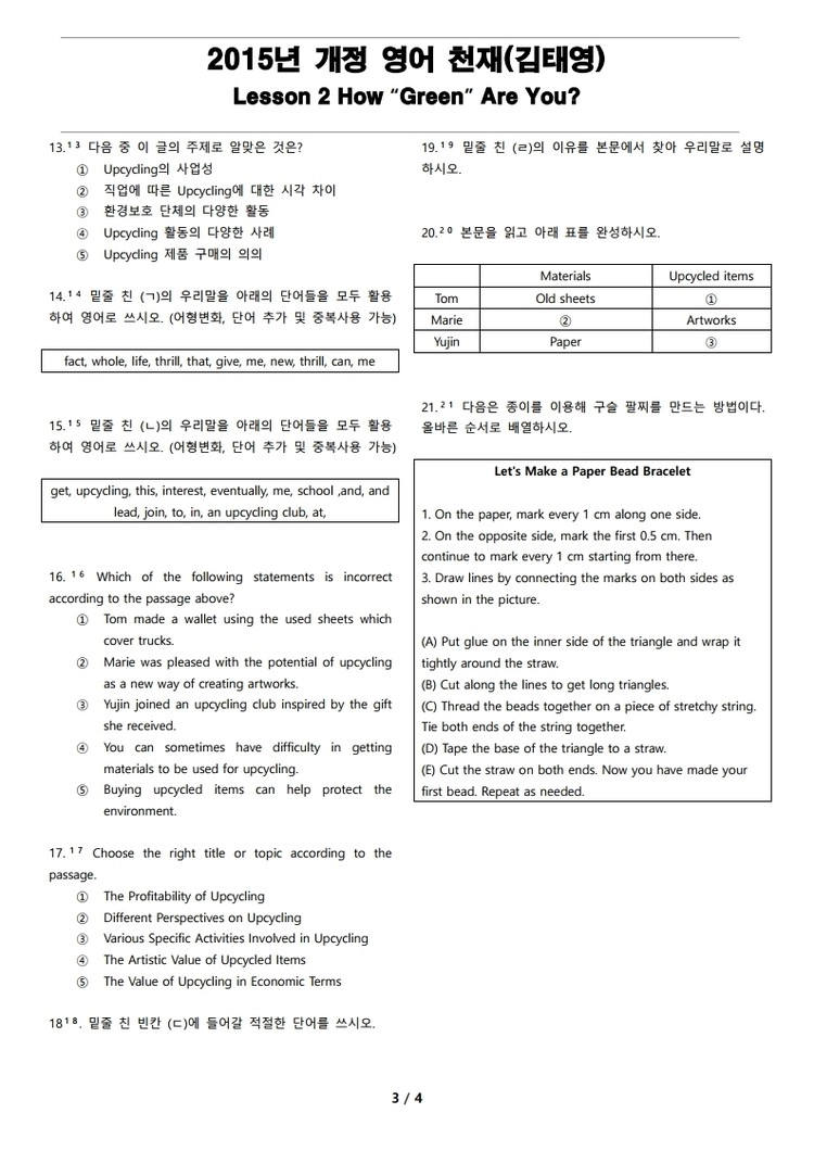 일반 워크북 형태의 문제에서 벗어나 The Makings가 만든 2015년 개정 영어 천재(김태영) 2과 변형 문제는