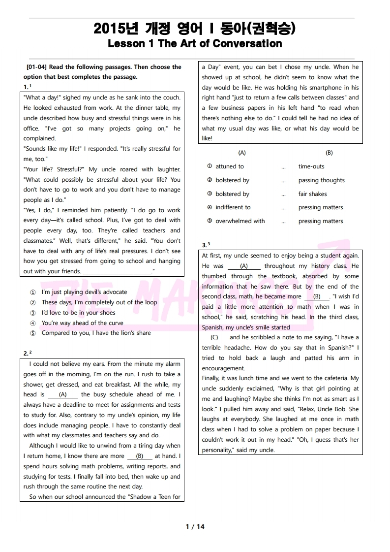 더메이킹스(The Makings)가 제작한 2015년 개정 영어 I 동아(권혁승) 변형 문제 1강의 지문입니다.