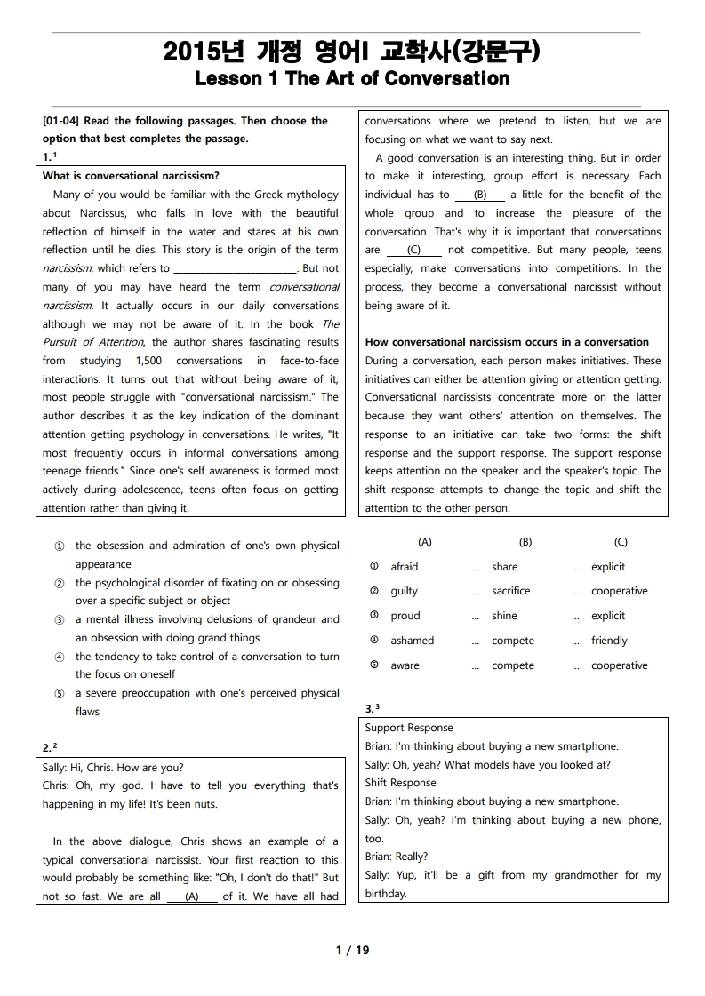 2015년 개정 영어 I 교학사(강문구) 1과 변형 문제 The Art of Conversation