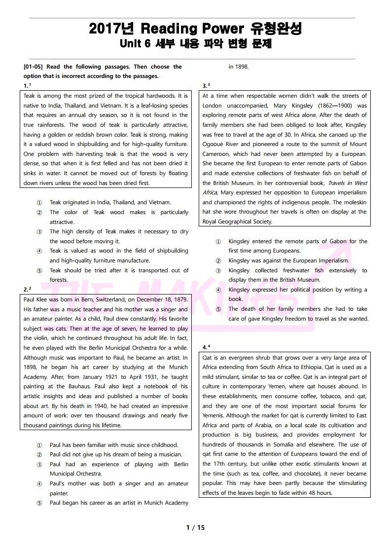현직에서 강사를 하고 있는 연구진들이 학생들을 위한 최상의 EBS 리딩 파워(Reading Power) 유형 완성 (2017년 개정) 변형 문제 6강을 선보입니다.