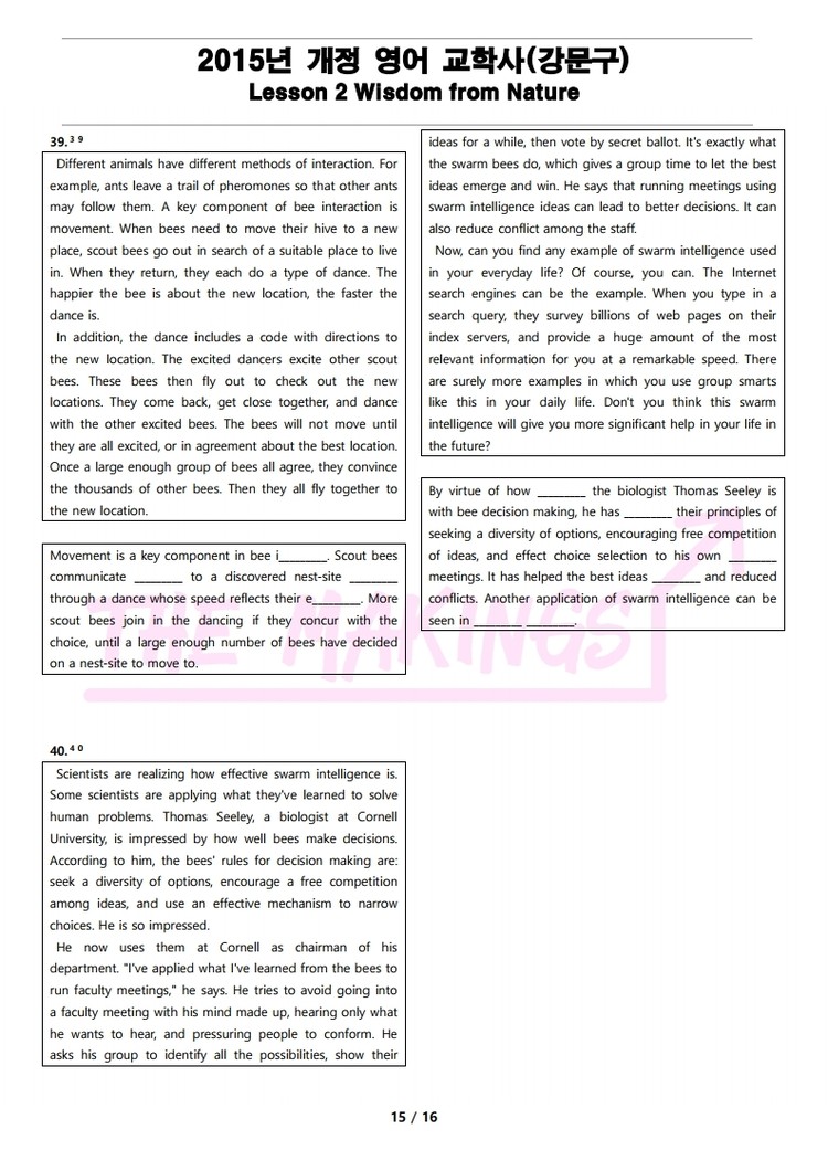 2015년 개정 영어 I 교학사(강문구) 2과 변형 문제 Wisdom from Nature