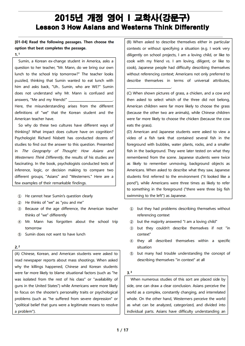 2015년 개정 영어 I 교학사(강문구) 3과 변형 문제 How Asians and Westerners Think Differently
