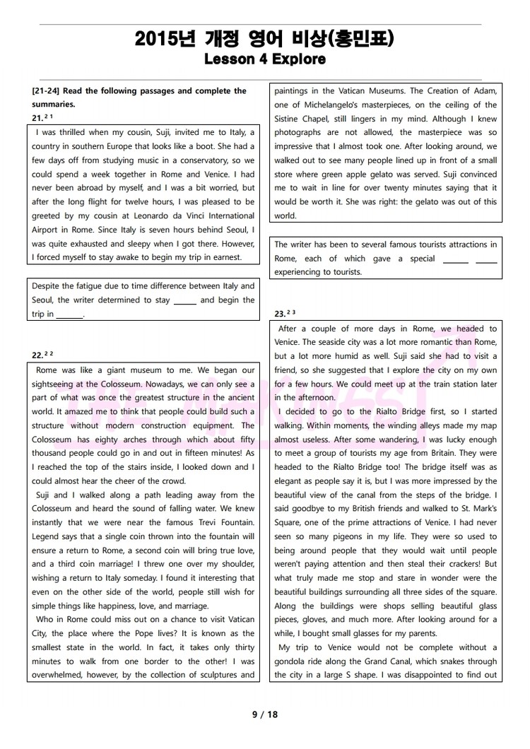 현직에서 강사를 하고 있는 연구진들이 학생들을 위한 최상의 2015년 개정 영어 비상(홍민표) 4과 변형 문제를 선보입니다.
