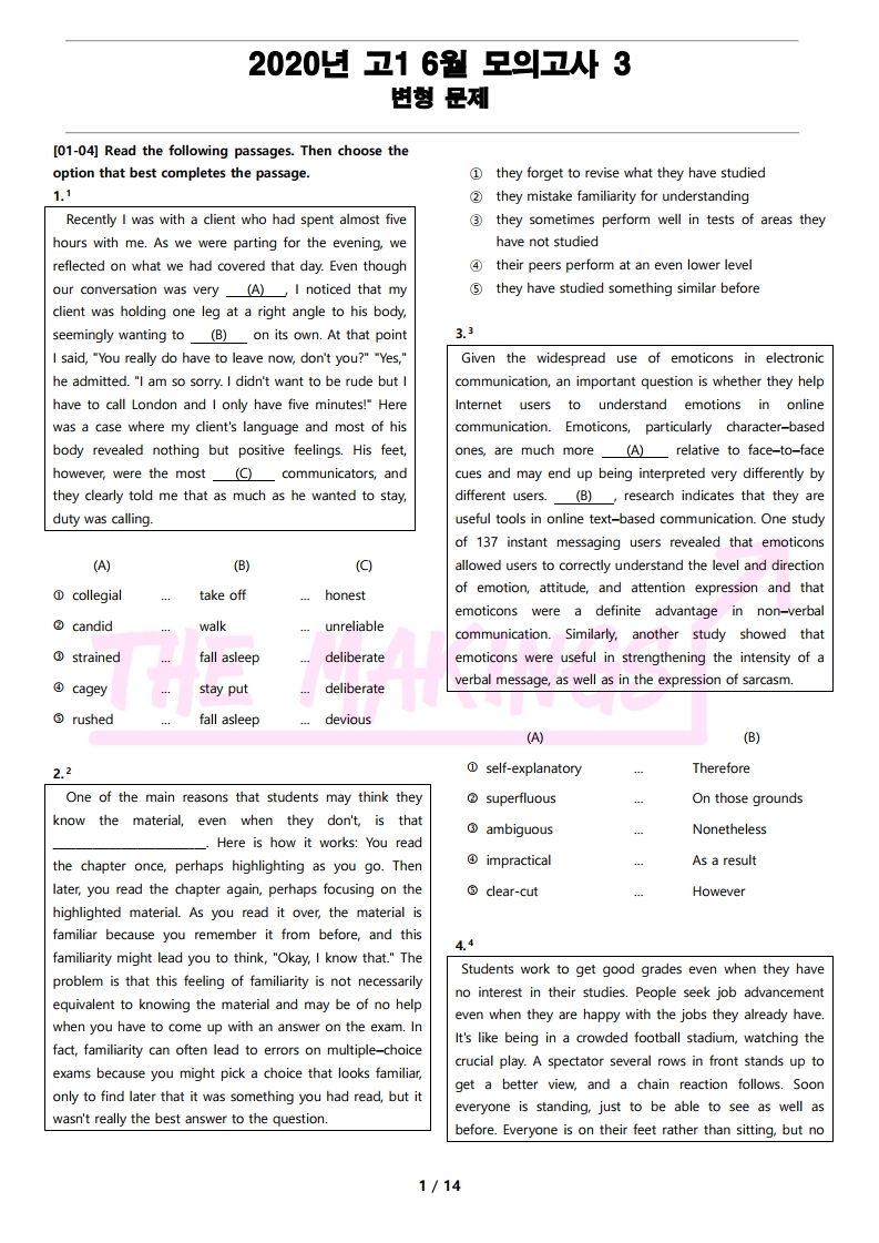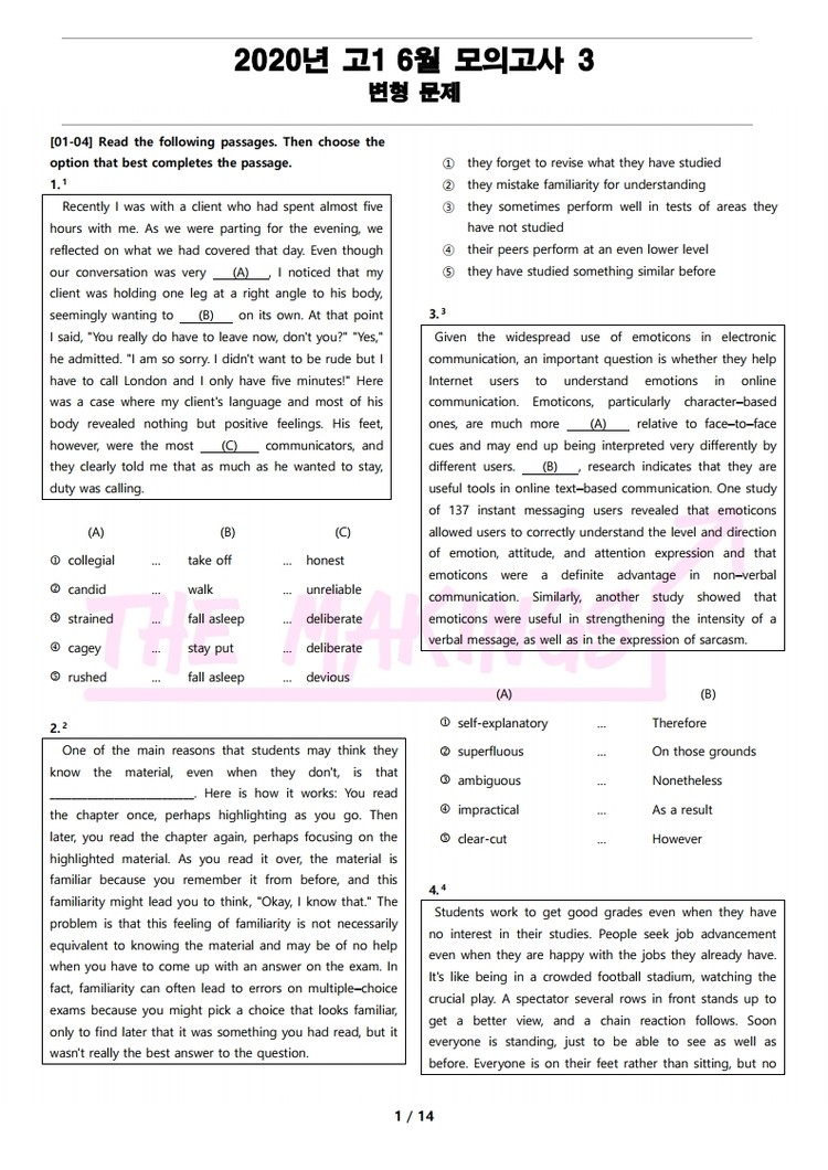 현직에서 강사를 하고 있는 연구진들이 학생들을 위한 최상의 2020년 고1 6월 전국 연합 모의고사 변형 문제 3 을 선보입니다.