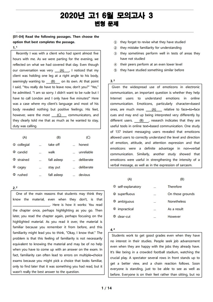 현직에서 강사를 하고 있는 연구진들이 학생들을 위한 최상의 2020년 고1 6월 전국 연합 모의고사 변형 문제 3 을 선보입니다.