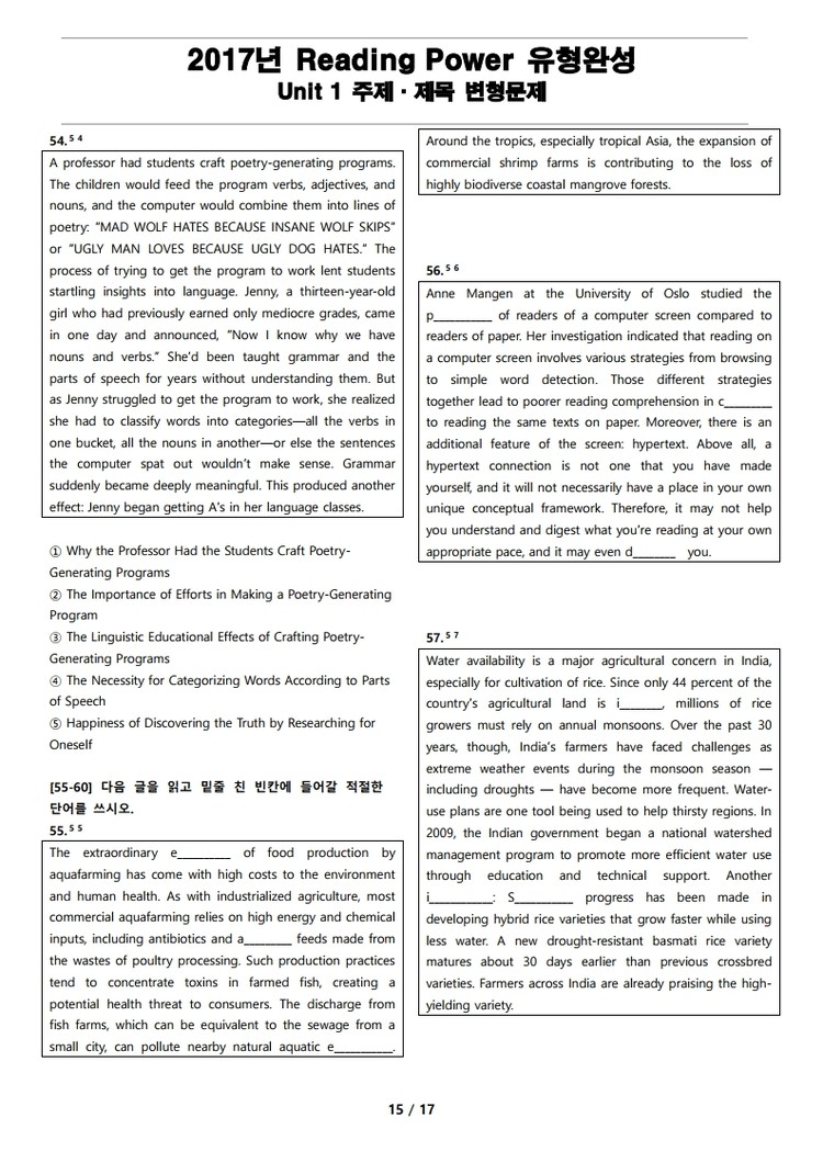 EBS 리딩 파워(Reading Power) 유형 완성 (2017년 개정) 변형 문제