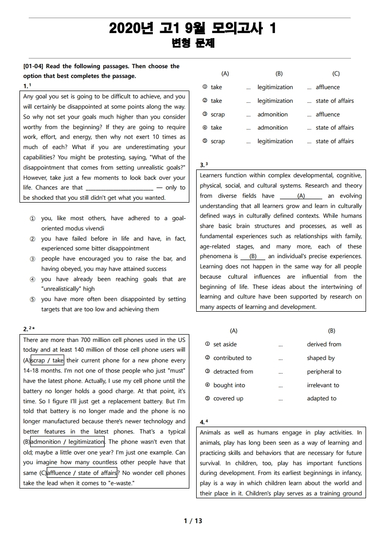 현직에서 강사를 하고 있는 연구진들이 학생들을 위한 최상의 2020년 고1 9월 전국 연합 모의고사 변형 문제 1 를 선보입니다.