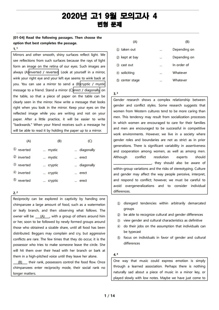 현직에서 강사를 하고 있는 연구진들이 학생들을 위한 최상의 2020년 고1 9월 전국 연합 모의고사 변형 문제 4 를 선보입니다.