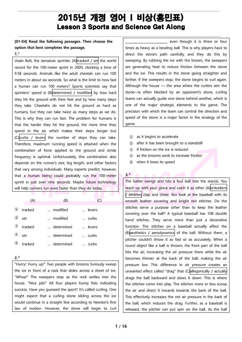 2015년 개정 영어 I 비상(홍민표) 3과 변형 문제 Sports and Science Get Along